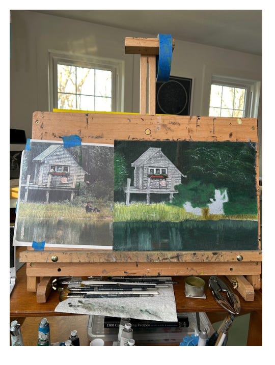 This week practicing focusing brought me back to the easel. In 2026, now that I’ve got my businesses running, I am going to focus on my art. Step one was to just finish this painting of my beloved fisherman’s shack I started so long ago that I can’t even remember when. Self-talk said, “Just paint these two fisherman, Linda!” So that is my step one, moving forward for 2026.